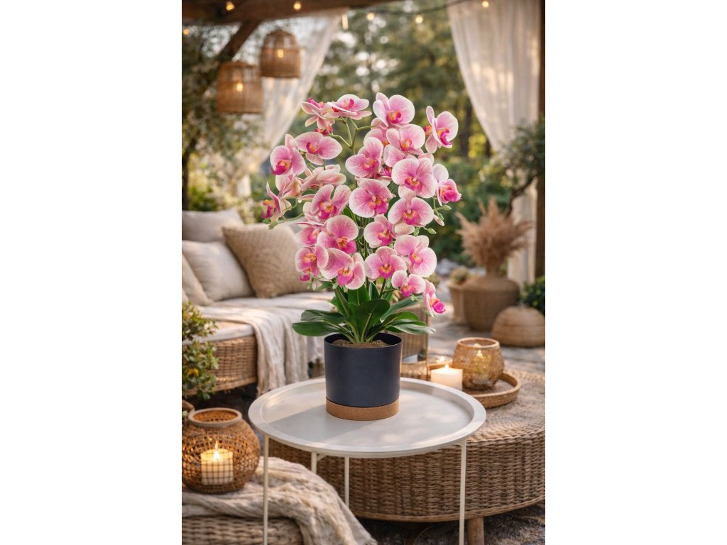 Elegantná dekoračná orchidea v jemných ružovo-bielych odtieňoch je výrazným, no zároveň vkusným doplnkom moderného interiéru. Precízne spracované kvety s realistickými detailmi pôsobia prirodzene a dodávajú priestoru sviežosť, eleganciu a nádych luxusu.