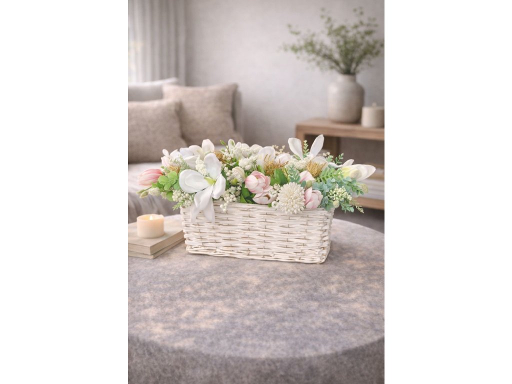 Elegantný dekoračný aranžmán v harmonickej kombinácii ružových, bielych a zelených tónov je ideálnym doplnkom pre moderný aj boho ladený interiér. Jemné kvety v spojení so sviežou zeleňou pôsobia prirodzene, vkusne a dodávajú priestoru pocit útulnosti a rovnováhy.