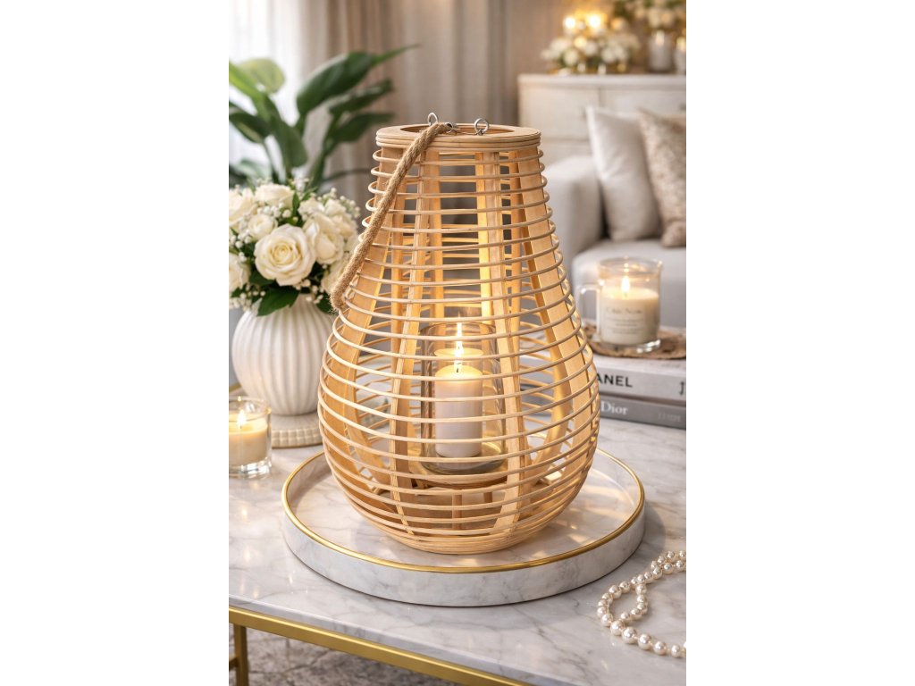Vytvorte si jedinečnú atmosféru s týmto štýlovým dekoratívnym lampášom, ktorý spája prírodné materiály s nadčasovým dizajnom. Jemná drevená konštrukcia v prírodnom odtieni pôsobí ľahko a vzdušne, zatiaľ čo sklenený valec vo vnútri chráni sviečku a zabezpečuje bezpečné používanie.