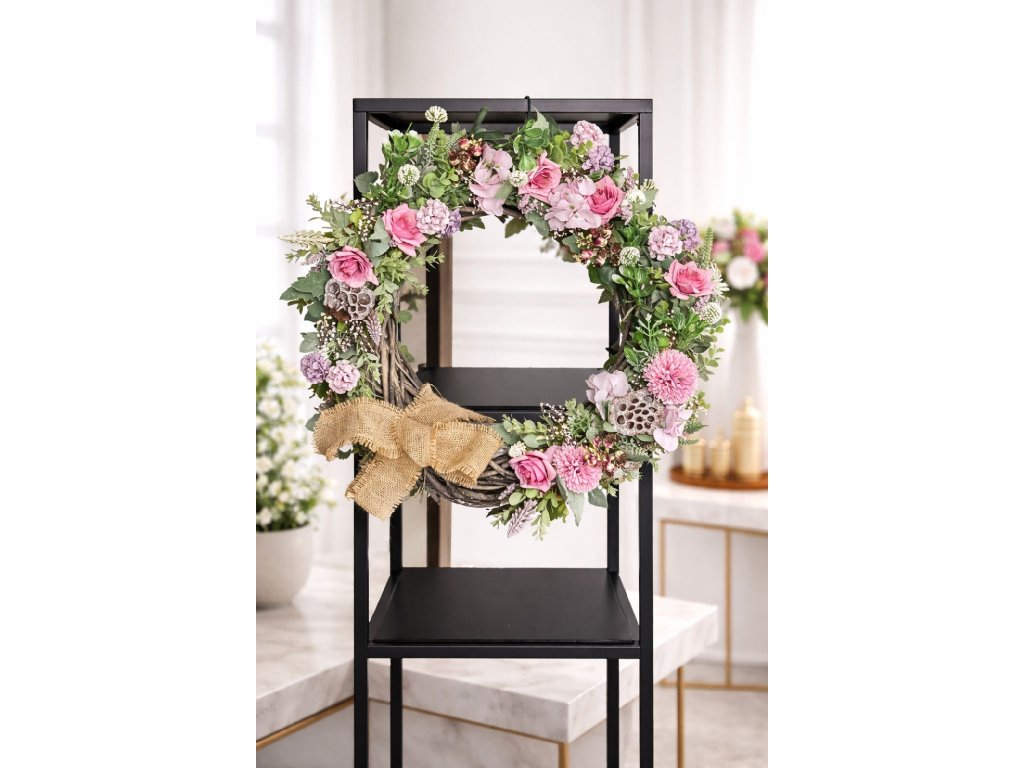 Elegantný dekoratívny veniec, ktorý vnesie do interiéru jemnosť, romantiku a prírodný šarm. Bohatá kvetinová kompozícia v ružových a staroružových odtieňoch, doplnená sviežou zeleňou, vytvára harmonický a luxusný vzhľad.