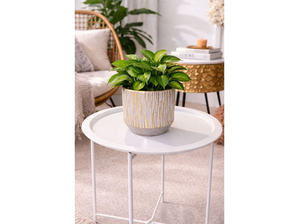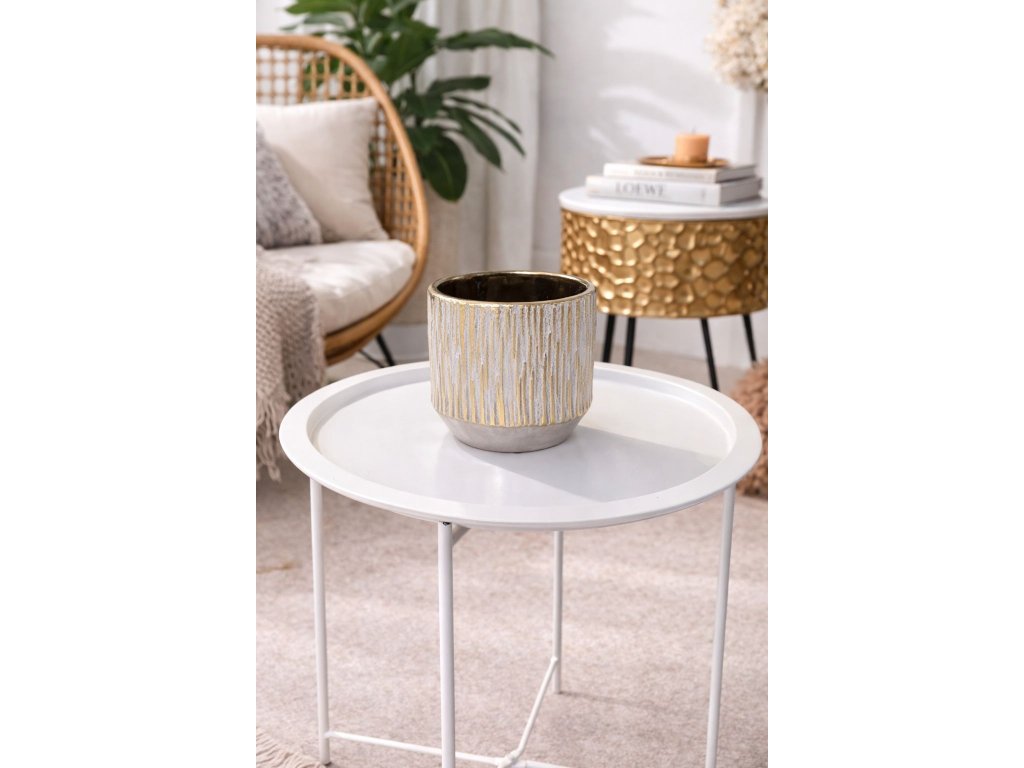 Elegantný dizajnový kvetináč v krémovo-zlatej farebnej kombinácii je štýlovým a nadčasovým doplnkom moderného interiéru. Jemné vertikálne rebrovanie so zlatými akcentmi dodáva kvetináču luxusný charakter, ktorý krásne vynikne v kombinácii so zelenými izbovými rastlinami.