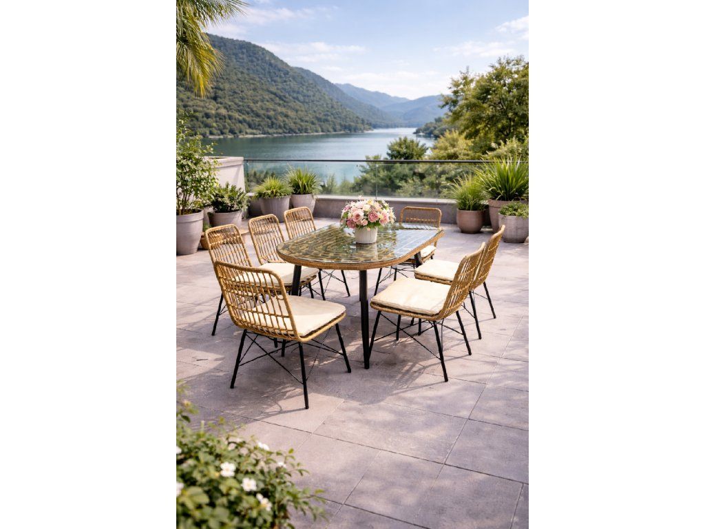 Jednoduchá a minimalistická zostava záhradného nábytku BOHO sa bude skvele hodiť na spoločné stolovanie alebo stretnutia s rodinou či priateľmi pod holým nebom. Skladá sa zo 4 pohodlných stoličiek a veľkého jedálenského stola s priehľadnou sklenenou doskou. Vankúše poskytnú pohodlie a sú dokonalým doplnkom k nábytku. Nábytok vo farbe slamy je vyrobený z kvalitného technoratanu, ktorý sa vyznačuje vysokou odolnosťou.