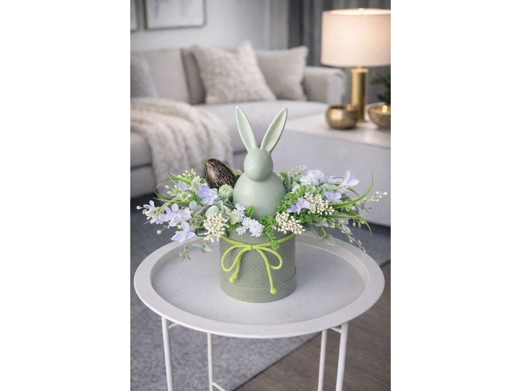 Vneste do svojho interiéru jemnosť a sviežu jarnú atmosféru s týmto štýlovým jarným aranžmánom so zeleným zajačikom. Pastelový zajačik je zasadený do harmonickej kombinácie zelene, drobných bielych a svetlofialových kvetov, ktoré spolu vytvárajú ľahký, elegantný a nadčasový vzhľad.