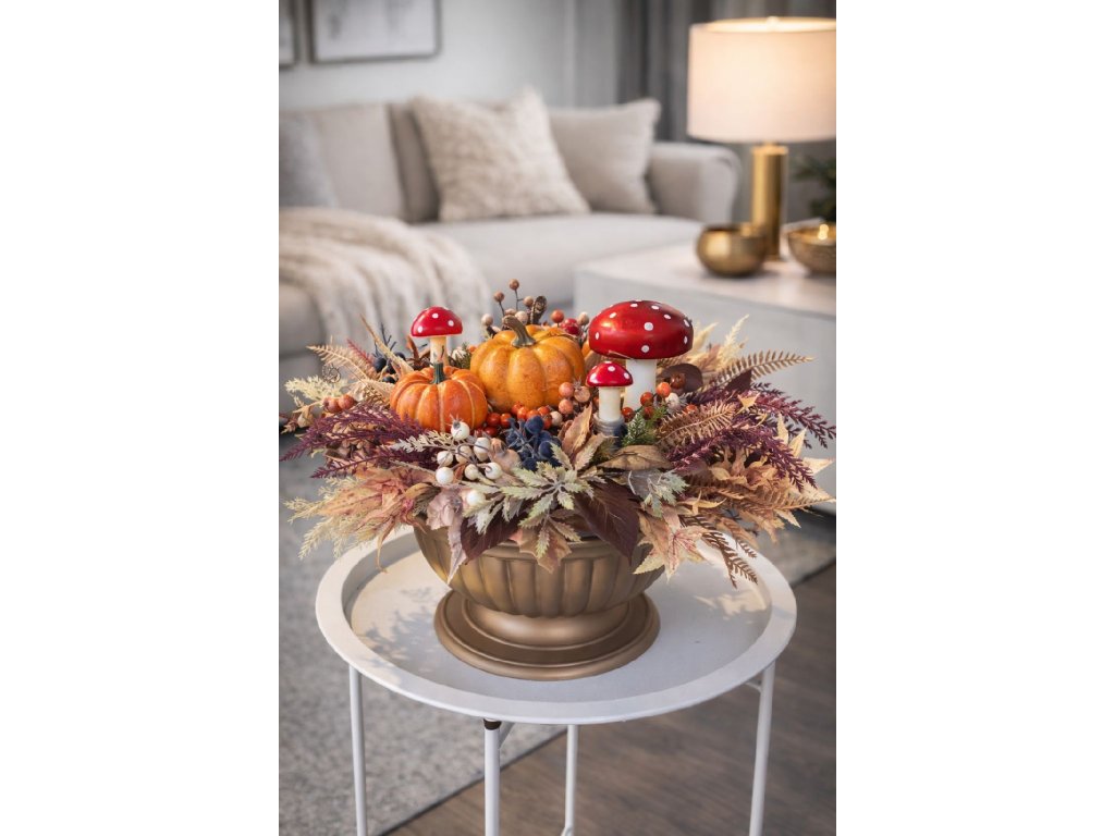 Vytvorte si doma útulnú a hravú jesennú atmosféru s týmto originálnym dekoratívnym aranžmánom s tekvicami a muchotrávkami. Bohatá kombinácia jesenných listov, drobných plodov, prírodných tónov a výrazných červených dekoratívnych húb vytvára jedinečný dizajn, ktorý okamžite pritiahne pozornosť.