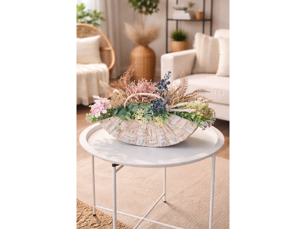 Elegantný kvetinový aranžmán v prútenom koši je ideálnym doplnkom pre moderný aj prírodne ladený interiér. Kombinácia kvalitných umelých kvetov, dekoratívnych listov a jemných pastelových tónov vytvára harmonický a nadčasový vzhľad. Prútený košík s rustikálnym efektom dodáva aranžmánu prírodný charakter a útulnosť.