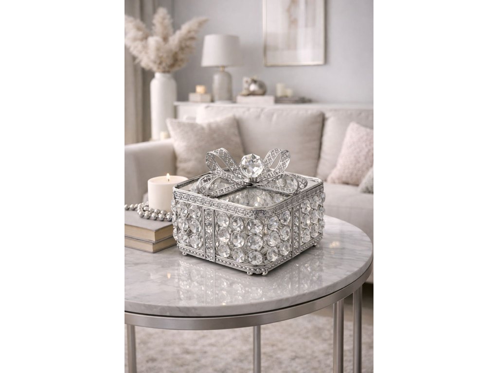 Luxusná dekoratívna šperkovnica v zlatom a striebornom prevedení je elegantným doplnkom do každého interiéru. Precízne spracovanie s lesklými kryštálmi dodáva produktu exkluzívny vzhľad a jemný glamour štýl. Ideálna na uloženie šperkov, drobností alebo ako výrazná dekorácia do obývačky, spálne či na konferenčný stolík.