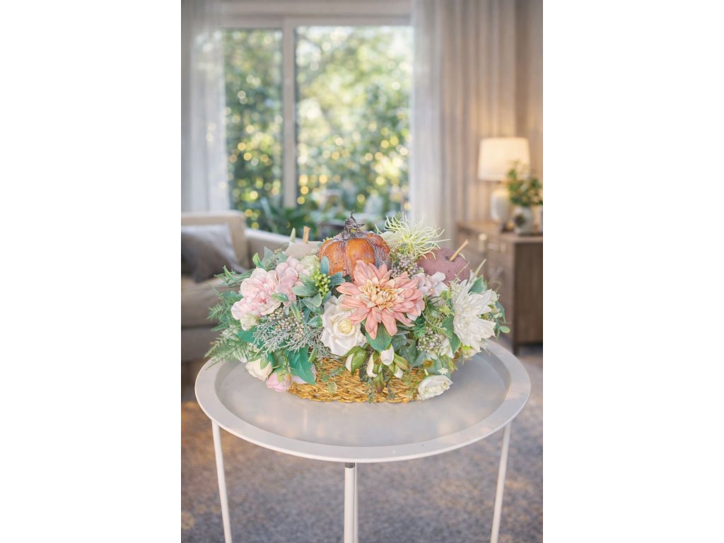 Elegantná jesenná dekorácia v luxusnom prevedení, ktorá okamžite zútulní každý interiér. Bohatá kvetinová kompozícia v prírodnom prútenom košíku je doplnená o dekoratívnu tekvicu, realistické kvety v jemných pastelových odtieňoch a zeleň, vďaka čomu pôsobí harmonicky a nadčasovo.