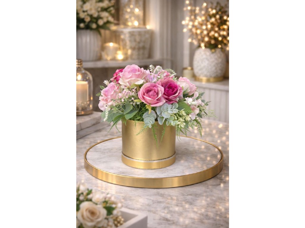 Kvety sú osadené v matnom zlatom valcovom obale, ktorý podčiarkuje exkluzívny charakter dekorácie a dodáva priestoru noblesný akcent. Precízne spracovanie detailov a kvalitné materiály zaručujú, že dekorácia si zachová svoj elegantný vzhľad po celý rok – bez potreby údržby.