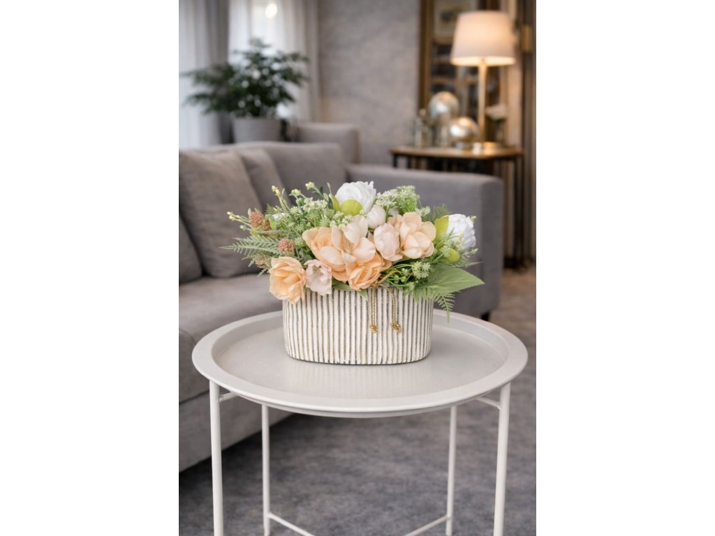 Elegantná kvetinová dekorácia v krémovo-bielej keramickej miske je dokonalým doplnkom pre svetlé, moderné a romanticky ladené interiéry. Jemná kombinácia realistických umelých kvetov v broskyňových, krémových a bielych odtieňoch pôsobí prirodzene, sviežo a veľmi harmonicky.
