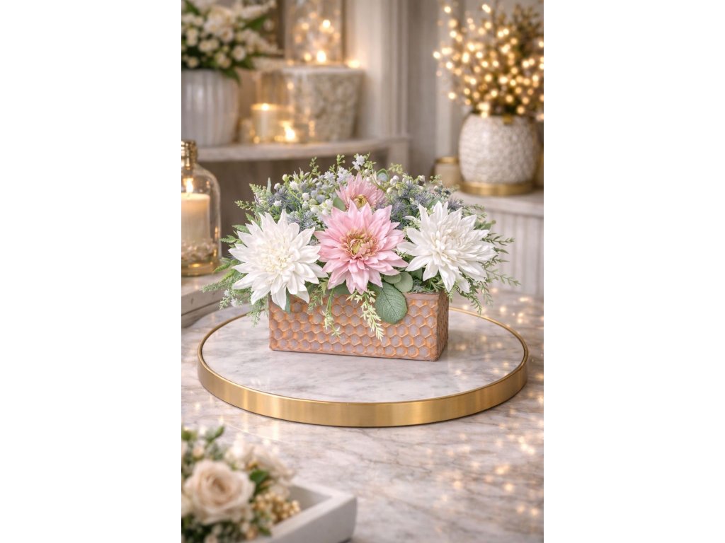 Elegantná kvetinová dekorácia s realistickými dahliami v jemných ružových a bielych odtieňoch je štýlovým doplnkom, ktorý dodá interiéru noblesu a harmonickú atmosféru.