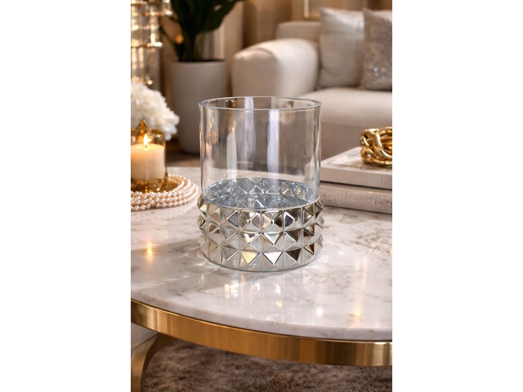 Dodajte svojmu interiéru nádych elegancie a nadčasového luxusu. Táto dizajnová sklenená váza zaujme na prvý pohľad kombináciou číreho skla a výraznej zrkadlovej základne s geometrickým 3D vzorom. Precízne spracovanie a moderný glamour dizajn z nej robia ideálny bytový doplnok do obývačky, spálne aj reprezentatívnych priestorov.