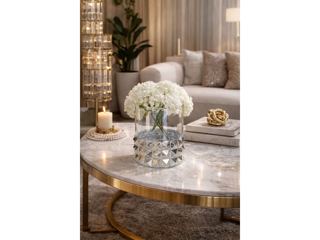 Váza je perfektná na čerstvé kvety, sušené aranžmány, ale aj ako samostatný dekoratívny prvok. Vynikne na konferenčnom stole, komode či luxusne prestretom stolíku a krásne odráža svetlo, čím vytvára exkluzívnu atmosféru.