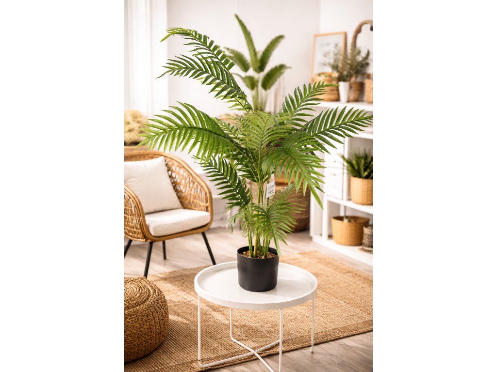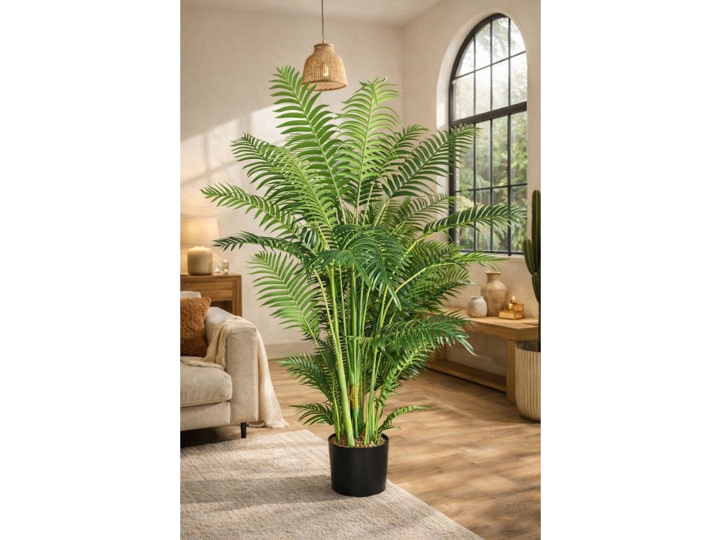 Táto elegantná dekoratívna umelá palma je dokonalým doplnkom pre moderné aj nadčasové priestory. Vďaka realistickému spracovaniu listov, prirodzenej farbe a harmonickému tvaru pôsobí na prvý pohľad veľmi autenticky a dodáva priestoru pocit sviežosti, pokoja a luxusu.