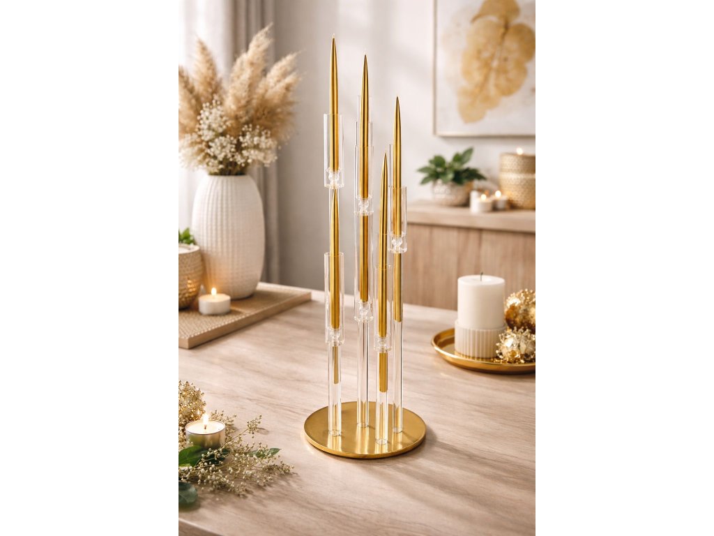 Elegantný 6-ramenný svietnik s výškou 100 cm je výrazným dizajnovým prvkom, ktorý dodá interiéru aj slávnostnej výzdobe exkluzívny a luxusný vzhľad. Kombinácia čírych sklenených ramien a zlatej kovovej základne pôsobí moderne, nadčasovo a veľmi reprezentatívne.