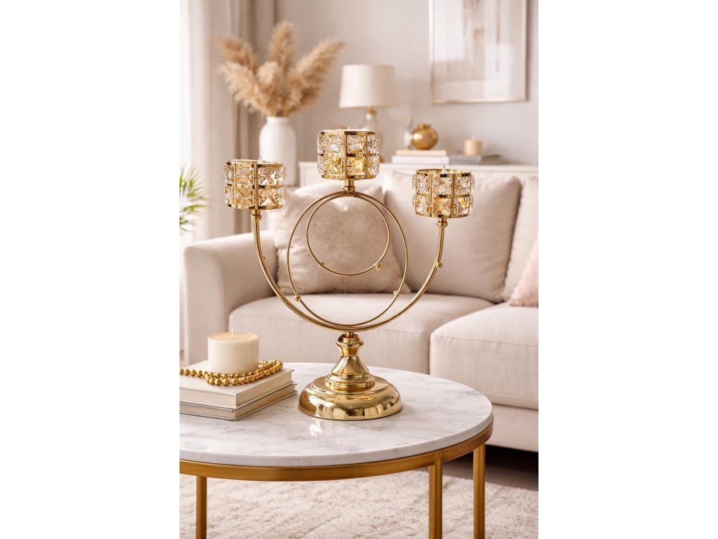 Elegantný dekoratívny svietnik s výškou 38 cm vyniká jedinečným dizajnom s tromi ramenami a krištáľovými pohárikmi. Zlatá kovová konštrukcia v kombinácii s brúsenými krištáľovými detailmi vytvára luxusný a nadčasový vzhľad, ktorý okamžite zaujme.