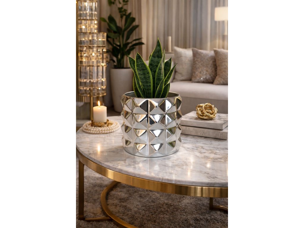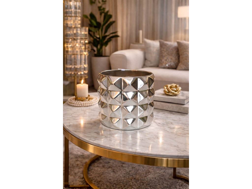 Tento exkluzívny kvetináč je výrazným dizajnovým prvkom, ktorý dodá interiéru moderný glamour vzhľad. Zrkadlový povrch s plastickým geometrickým vzorom vytvára luxusný 3D efekt a krásne odráža svetlo, vďaka čomu pôsobí kvetináč elegantne a prémiovo z každého uhla.