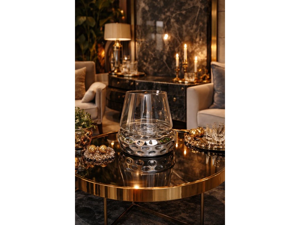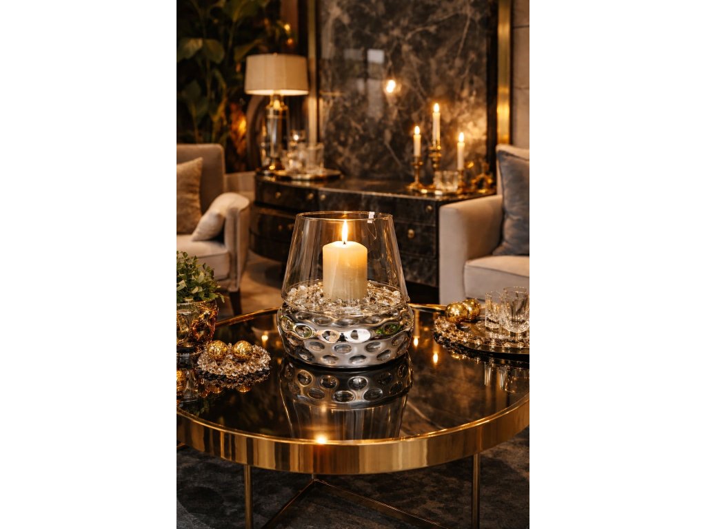 Tento exkluzívny sklenený svietnik je výrazným dizajnovým doplnkom, ktorý okamžite pritiahne pozornosť. Kombinácia číreho skla a lesklého chrómového základu vytvára moderný, nadčasový vzhľad s nádychom luxusu.
