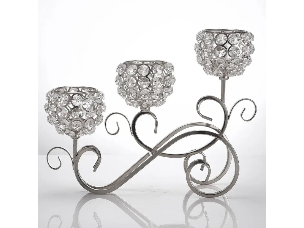 Dekoratívny luxusný svietnik v striebornom prevedení. Tento svietnik obsahuje 3 krištáľové korálkové poháre posadené na elegantných posuvných lištách z lesklého kovu.