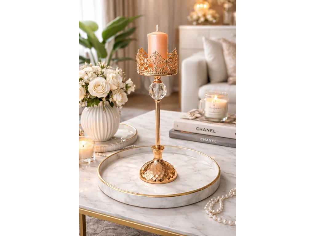 Svietnik je doplnený o dekoratívny krištáľový prvok, ktorý krásne odráža svetlo a vytvára príjemnú, teplú atmosféru. Ideálny je na konferenčný stolík, jedálenský stôl, komodu či konzolový stolík. Perfektne zapadne do moderných, luxusných aj glamour interiérov.