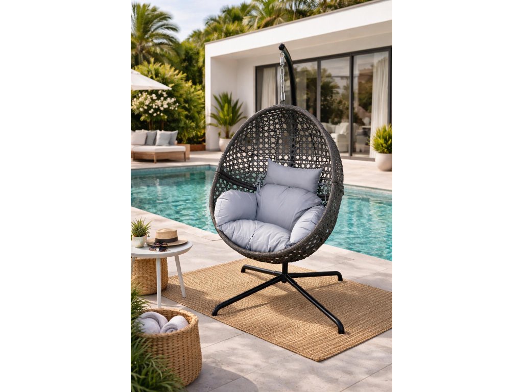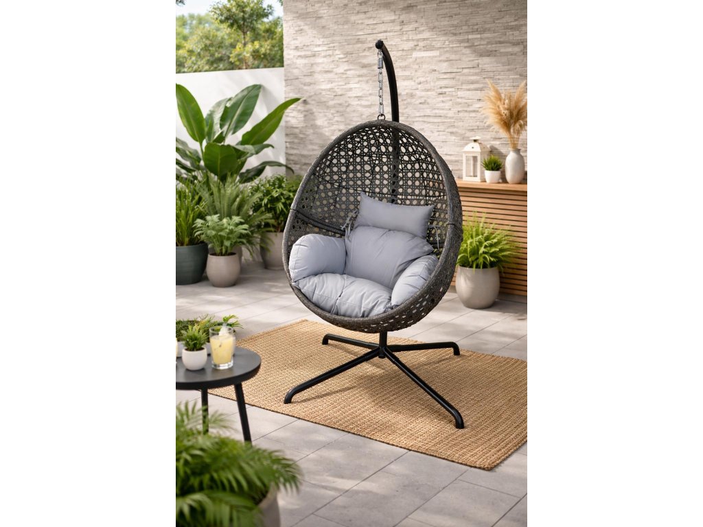 - Skladacie závesné kreslo so ŠEDÝMI vankúšmi.
